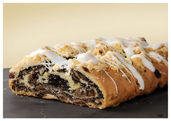 Süßer Christstollenteig aus hochwertigen Rohstoffen umhüllt eine leckere Füllung aus Mohn, Trockenfrüchten (enthält Rosinen) und Gewürzen. Traditionell wird diese Stollen-Art mit Knusper-Streuseln und Zuckerguss-Streifen verziert. Sorgen Sie für Abwechslung auf Ihrem weihnachtlichen Kaffeetisch und probieren Sie diese schlesische Spezialität nach altbewährter Rezeptur!